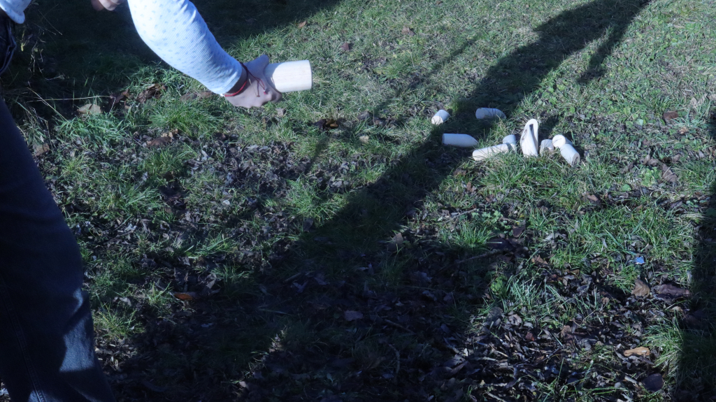 - im Freien gespieltes skandinavisches Geschicklichkeitsspiel- mit einem Wurfholz auf zwölf hochkant stehende Spielhölzer geworfen wird