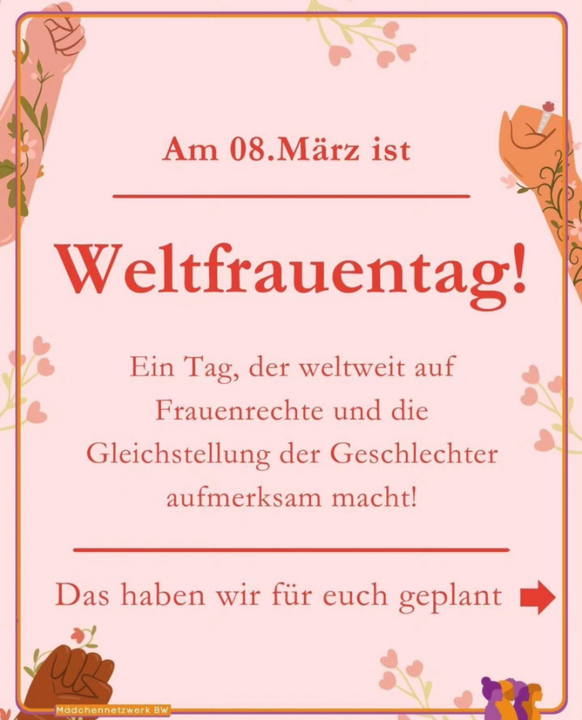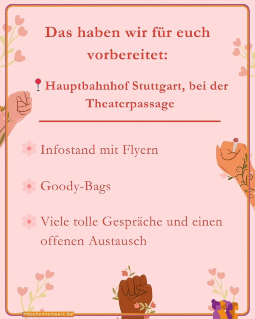 Kommt gerne am 8.3. von 15-17 Uhr zu unserem Stand zum Weltfrauentag an der Theaterpassage in Stuttgart und tauscht euch mit uns aus, informiert euch über den Weltfrauentag – und sichert euch unsere heißbegehrten Goodies 👀 Mehr Infos findet ihr auf Instagram (maedchennetzwerk.bw). Wir freuen uns auf euch! 💗