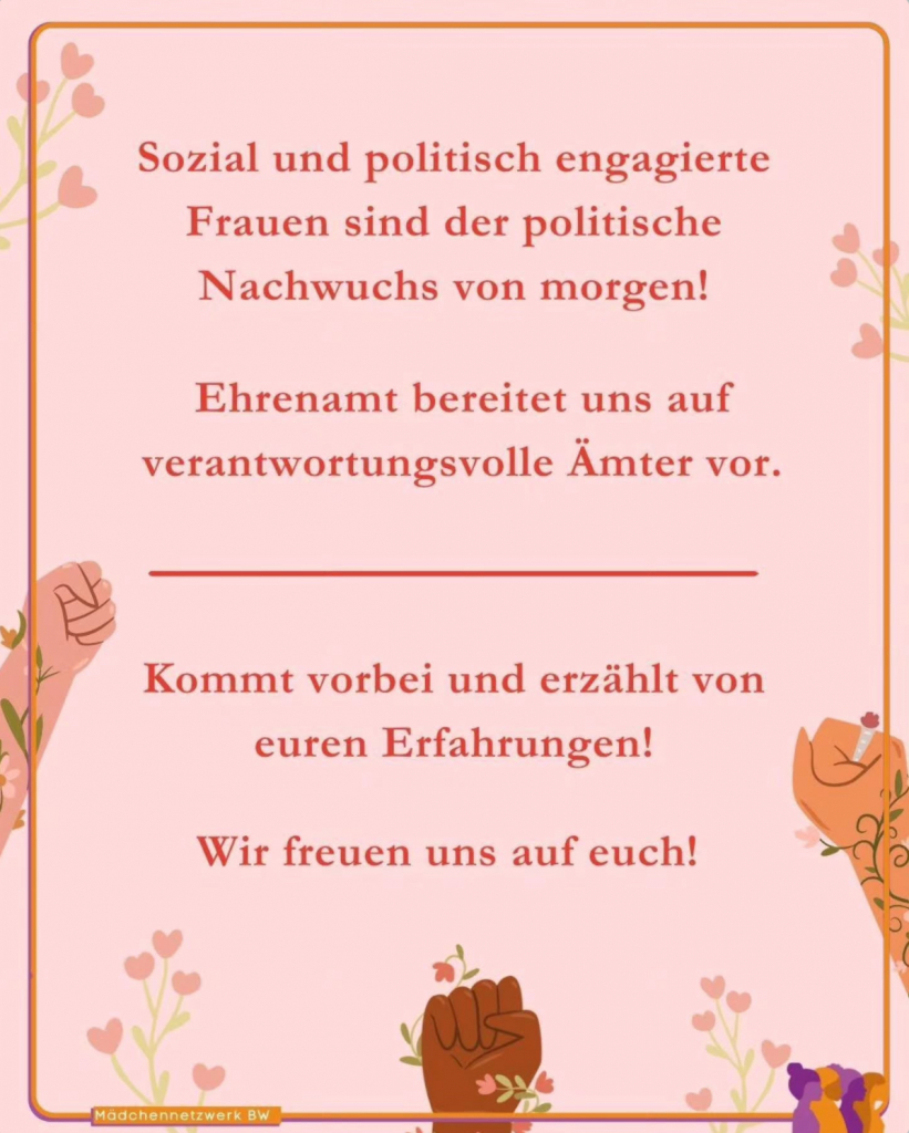 Im März 2024 gründete der Dachverband der Jugendgemeinderäte BW das Mädchen*netzwerk BW. Landtagspräsidentin Muhterem Aras hatte dazu alle Teilnehmerinnen und Unterstützerinnen in den Landtag eingeladen. Organisationen informierten auf einem Markt der Möglichkeiten junge Frauen über Möglichkeiten zu gesellschaftlichen und politischem Engagement. Bereits im November 2023 hatten sich rund 50 Interessierte zu einem Brainstorming Treffen im Marchivum (Stadtarchiv) in Mannheim getroffen und die Gründung vorbereitet. Ziel ist es, junge engagierte Frauen miteinander zu vernetzen und für eine Kandidatur für Haupt- und Ehrenämter im sozialen und politischen Bereich fortzubilden. Mitmachen können alle junge Frauen*, die sich gerne für ihre Themen einsetzen und Verantwortung übernehmen möchten. Ein Amt im Jugendgemeinderat ist keine Voraussetzung.